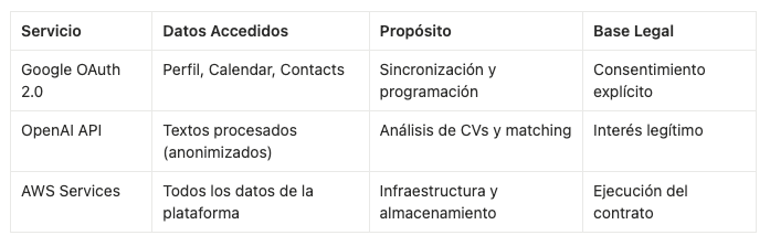 - Proveedores de servicios esenciales (AWS para almacenamiento, bajo acuerdos de confidencialidad)